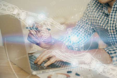 Double exposure of man's hands typing over computer keyboard and brain hologram drawing. Top view. Ai and data technology concept.