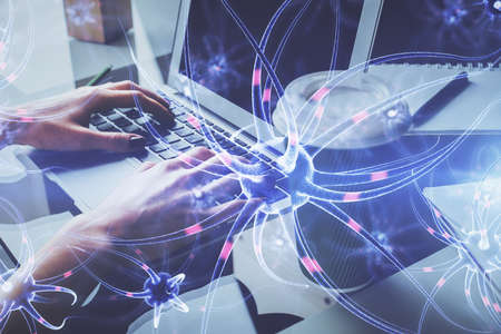 Double exposure of woman hands typing on computer and neuron drawing. Education concept.