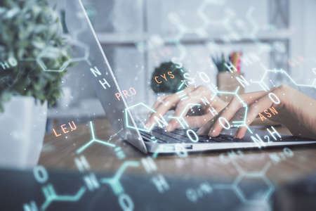 Creative chemistry hologram with hands typing on computer keyboard on background, pharmaceutical research concept. Multiexposure