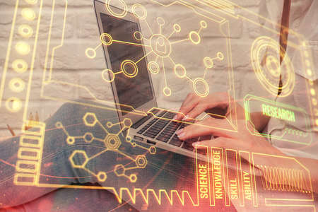 Double exposure of woman hands typing on computer and technology theme drawing. High Tech concept.