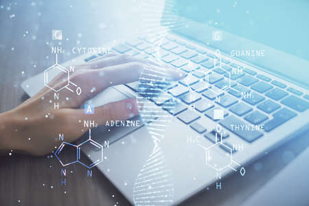 Double exposure of woman hands typing on computer and DNA hologram drawing. Medical education concept.