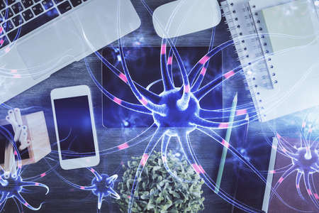Double exposure of neuron drawing over table with phone. Top view. Science education concept.