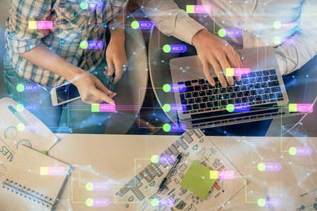 Double exposure of man and woman working together and data theme hologram drawing. Computer background. Top View.