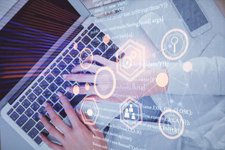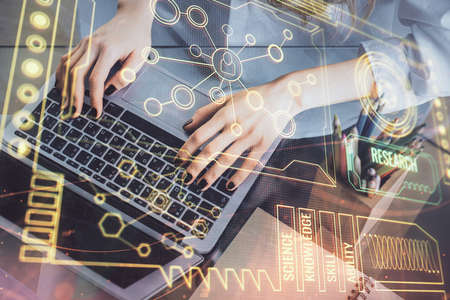Double exposure of woman hands working on computer and data theme hologram drawing. Tech concept.