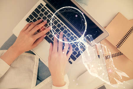 Double exposure of woman hands working on computer and creative hologram drawing. Top View. Start up concept.