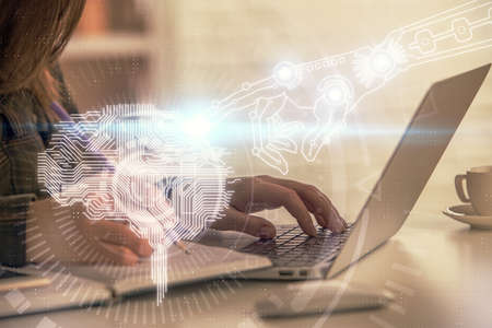 Multi exposure of woman hands working on computer and human brain hologram drawing. Ai tech concept.