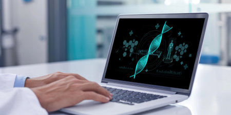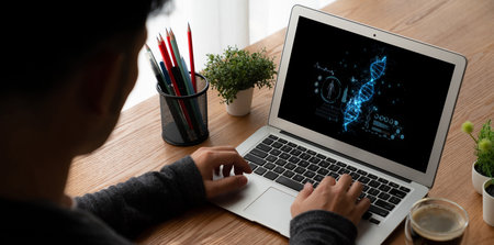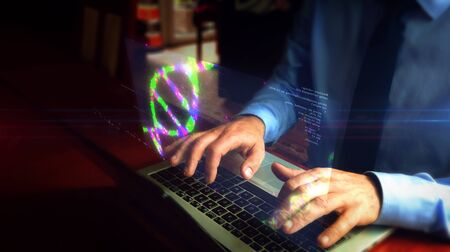 Man typing on laptop with DNA helix hologram screen over keyboard. Genetics, biology, science and molecular technology concept. Hand camera shake.