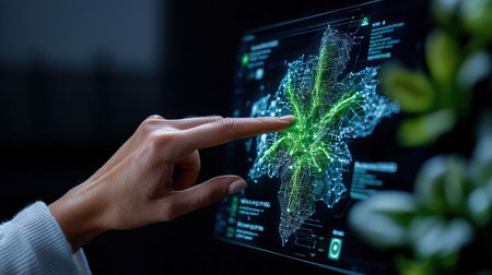 A person is pointing at a green flower on a computer screen. The flower is surrounded by a network of lines and dots, giving it a futuristic appearance
