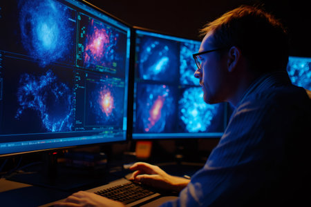 Scientist working late at night, analyzing data from space telescopes on multiple computer screens, searching for new discoveries in the universe