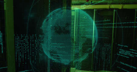 Image of data processing and globe over server room. Global business and digital interface concept digitally generated image