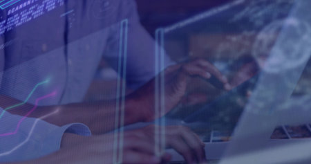 Typing analyst wearing long sleeve shirt at desk showing laptop keyboard with graph text overlays. Technology, data, analytics, digital, workspace, modern, interface