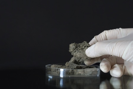 Close-up scientist examining sampling of toxic chemicals on polluted ground
