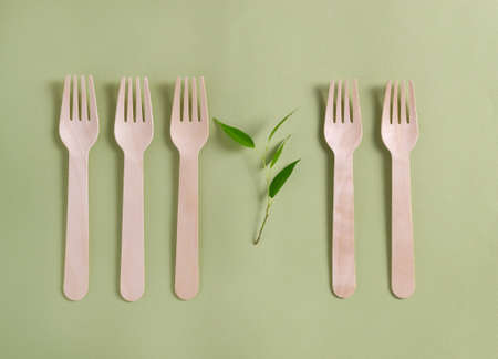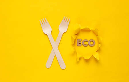 Eco-friendly wooden forks on yellow background. Word eco on torn hole paper. Minimalism. Top view