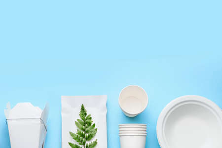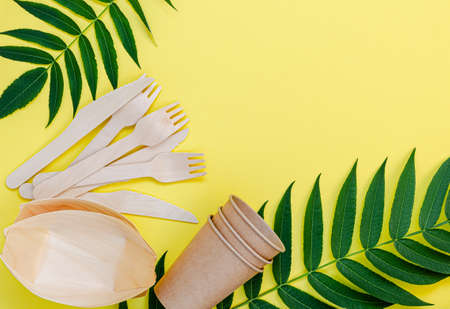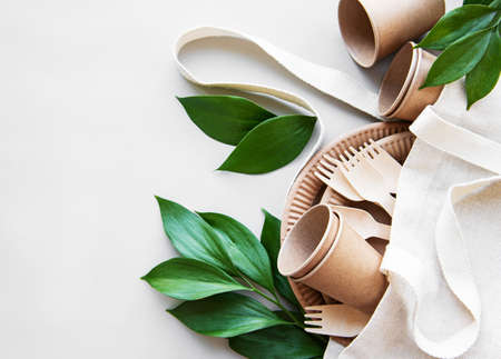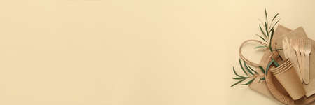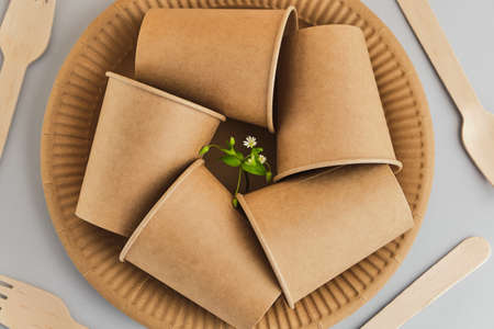 Zero waste, disposable paper tableware, top view. Plastic free concept