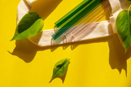 Reusable glass Straws on colorful background with green leafs in eco bag Eco-Friendly Drinking Straw Set Reusable Comfortable Rounded tip Drinking Straw. Zero waste, plastic free concept. Sustainable lifestyle. Picnic concept
