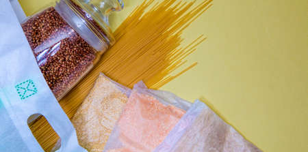 Food items for donation, on a yellow background. Buckwheat in containers for bulk products. Macaroni, cereals in a cellophane bag. With space for text. Vertical photo.