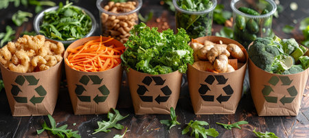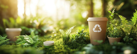 This image highlights sustainable living through eco-friendly packaging A paper recycling sign is showcased amidst biodegradable tableware and green plants, symbolizing eco-conscious alternatives It promotes zero-waste living via compostable materials and responsible consumerism Ideal for illustrating environmental responsibility, it encourages planet-friendly choices and recycling to reduce our carbon footprint and AI Generative