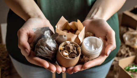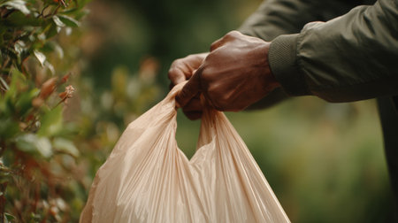 Medium shot focusing on hands placing recyclable materials into a biodegradable waste bag promoting green lifestyle choices.