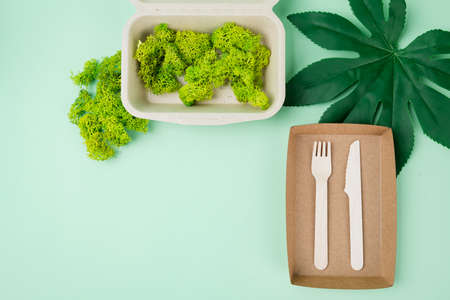 non-degradable plastic waste from disposable tableware and a set of dishes from environmental recycled materials on a green background. The concept of rejection of plastic, environmental conservation