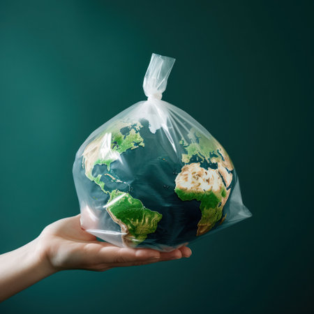 hand holding planet earth in a plastic bag, global warming, climate change, greenhouse gases, environmental protection concept