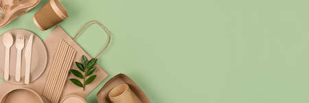 Sustainable food packaging - paper food cups, containers, paper bag, wooden bamboo cutlery set and drinking straws over green background with copy space. Street food take away paper utensils. Banner