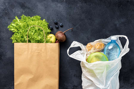 Zero waste concept. Paper bag with groceries and a plastic bag on dark background top view