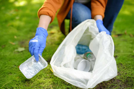 Volunteer picking up the plastic garbage and putting it in biodegradable trash-bag on outdoors. Ecology, recycling and protection of nature concept. Environmental protection.