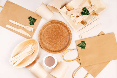 set of empty reusable disposable eco-friendly plates, cups, utensils on light white colored table background. top view. Biodegradable craft dishes. Recycling concept. Close-up.