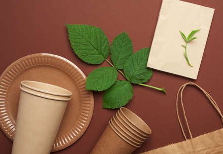 disposable tableware from brown craft paper, green leaf on a brown background. View from above, plastic rejection concept, zero waste, copy space