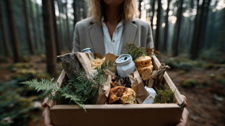 A woman stands amidst a tranquil forest, holding a box filled with fresh, natural products. The scene captures a connection with nature and sustainable living.