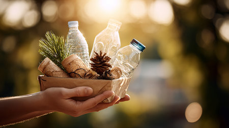 Volunteer holding a box of plastic bottles in nature. Zero waste concept.