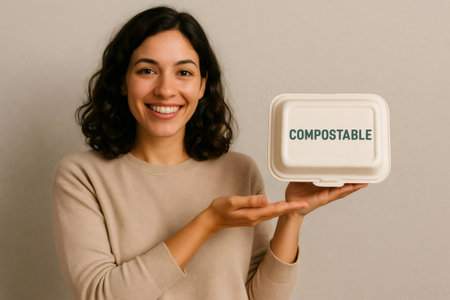 Smiling woman presenting a compostable food container, highlighting eco friendly practices and sustainable packaging solutions
