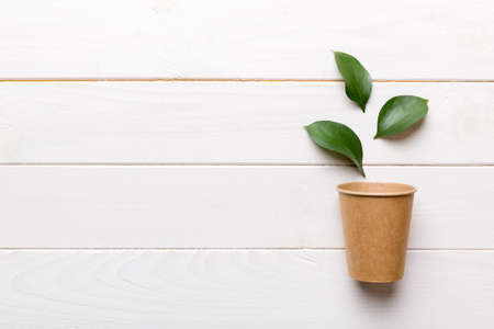 Zero waste cup with green leaf, environmentally friendly, disposable, cardboard, Eco-friendly coffee cup. top View with copy space.