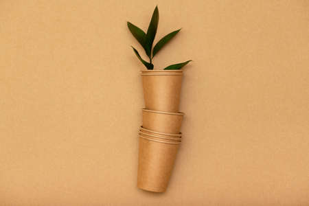 environmentally friendly. Recycling or the concept of zero waste, made from disposable cardboard glasses with a green branch with leaves. View from the top.
