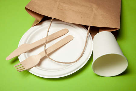 Eco friendly biodegradable paper disposable for packaging food and paper glass on green background.