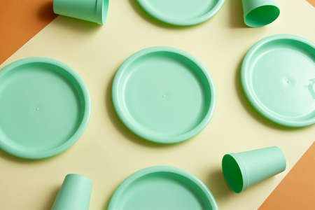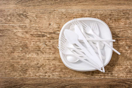 Disposable plastic crockery on wooden background. Top view. Copyspace