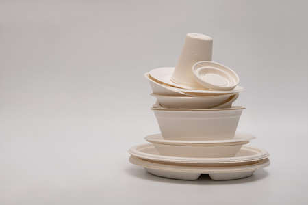 White plastic dishes in a paper packet on beige background. Concept of Recycling plastic and ecology