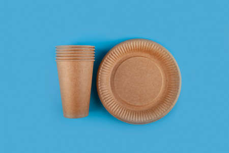 Disposable paper biodegradable cups and plates on a blue background. Top view with copy space. flat lay composition