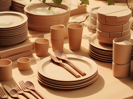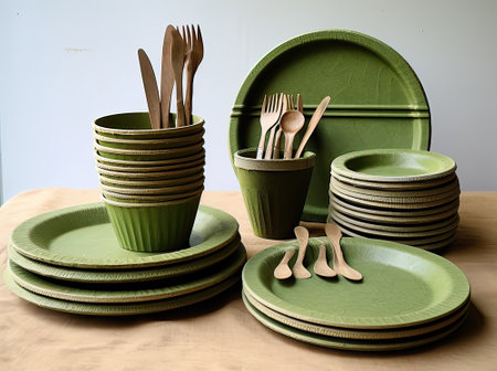 Medium shot of biodegradable party plates and cups arranged on a table showcasing ecofriendly event planning with natureinspired decor elements.