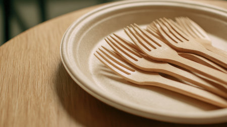 Medium shot showing biodegradable forks arranged neatly beside a compostable plate in an environmentally conscious dining hall.