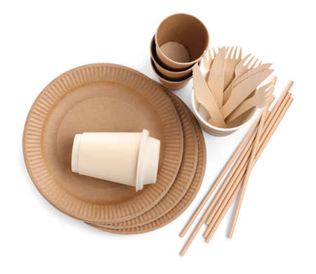 eco friendly disposable dishes made paper on white marble background. Draped spoons, fork, knives, plate with paper cups. recycling concept