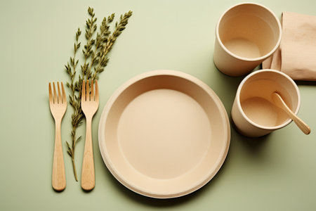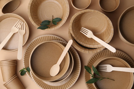 disposable paper and wood biodegradable tableware on a beige background, eco friendly lifestyle concept