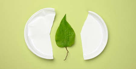 broken white plastic plate and green leaf on a green background. The concept of avoiding plastic, preserving the environment, top view