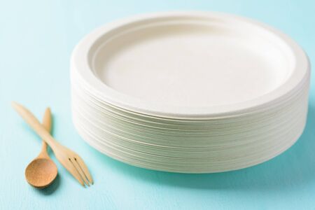 disposable paper and wood biodegradable tableware on a blue background, eco friendly lifestyle concept