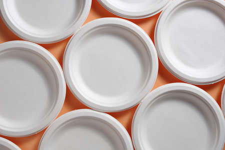 Disposable white plastic tableware on a beige background. The concept of nature pollution