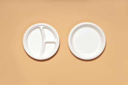 Two eco-friendly cornstarch dinner plates three-piece and flat on a beige paper background close-up, eco-friendly disposable plastic replacement, top view. Biodegradable tableware concept, zero waste.