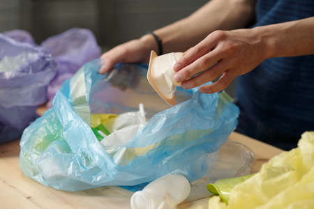 Hand of adolescent guy putting white small plastic yoghurt container into cellophane sack with similar waste while sorting trash in garage