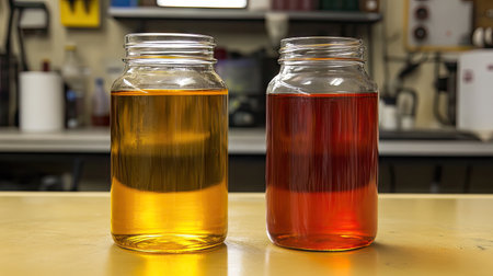 Two transparent jars containing vibrant yellow and red liquids sit on a laboratory countertop, highlighting clarity and color contrast in a scientific environment.