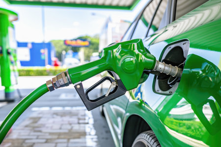 A closeup view of a hand holding a fuel nozzle while filling a car at a modern gas station. The image captures the interaction between driver and fuel pump in a bright, clean environment.