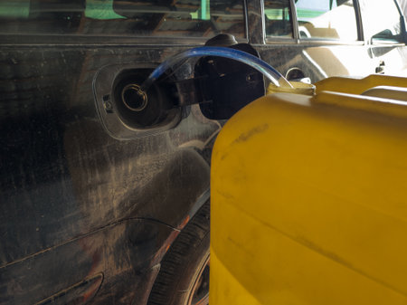 Large yellow container pours fuel into car's tank with clear tube. Practical scene captures outdoor setting and utilitarian mood of fueling process.